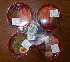 はま寿司で以前に新聞広告に入ってて、昨日に親戚の叔父さんと買いに行きました。電話で注文し開店の午前11時に取りに行ってます。画像下の4種類、全部税込み500円です!